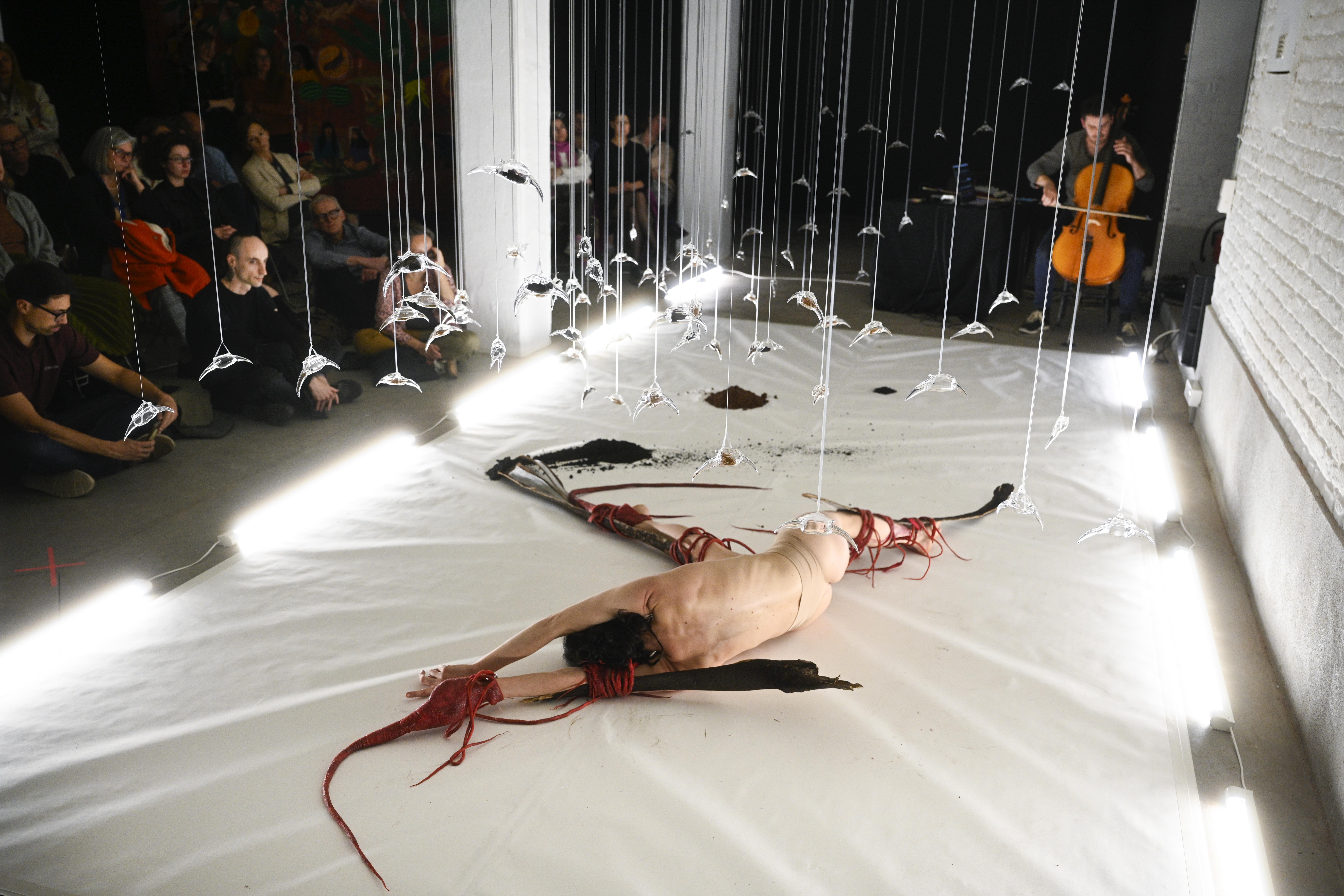 Žalovanje Margherite Pevere, glasba Ivana PenovaPretresljiva estetika in natančna raziskava projekta Lament vabita občinstvo k preizpraševanju smrti in regeneracije ekologij po požarih. V smrtni postelji, ki je več kot le človeška, Pevere postane talno bitje z lovkami, ki preiskuje prostor po požaru med kupi zemlje in steklenimi skulpturami, ki nizko visijo nad območjem. Glasba je spletena iz terenskih posnetkov, violončela in žive elektronike. Biotehnološke elemente instalacije in elemente kostuma je Pevere vzorčila po kraških požarih leta 2022, Penov pa je raziskoval bioakustiko in skrite zvoke požganega gozda. Delo je tudi poklon kraškemu ekosistemu in njegovim ranljivim ekosistemom, ki sta jih oba umetnika vzljubila v letih, preživetih med Trstom in Gorico.Projekt je prejel nagrado COAL Prize 2024 Transformative Territories. https://margheritapevere.com/lament/